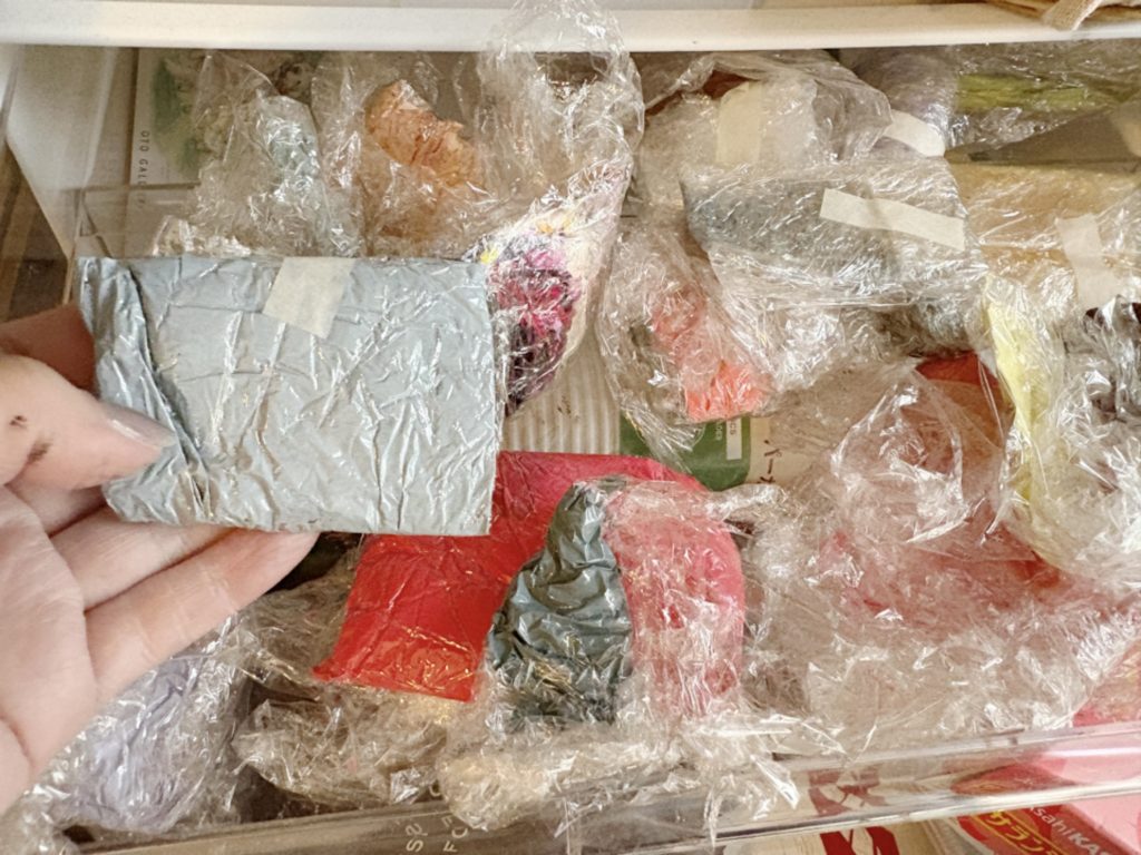 リトグラフのインクは乾きずらいので可愛い色が作れたらラップに包んで保存しておきます。