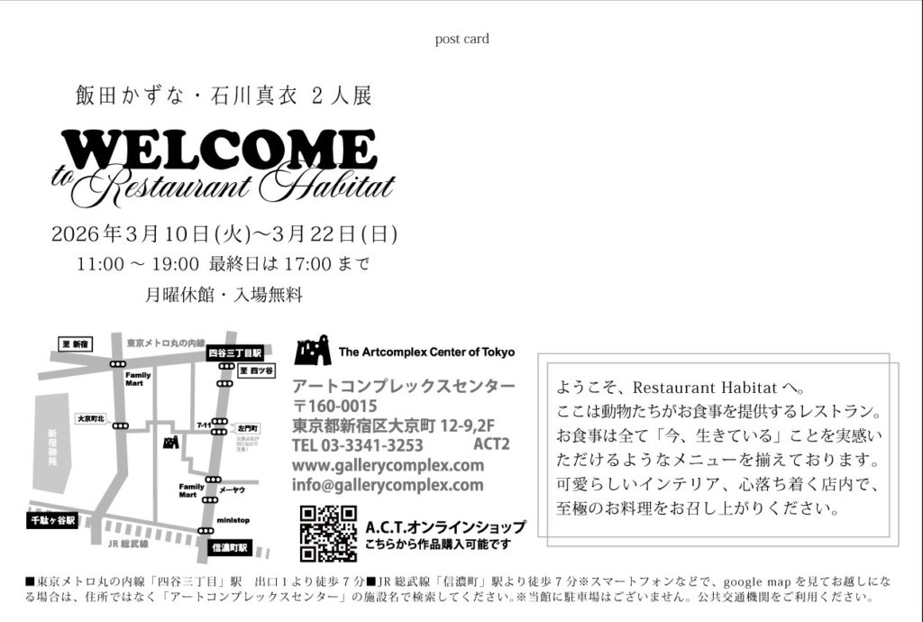 このたび、アートコンプレックスセンターでは飯田かずなと石川真衣による2人展「WELCOME to Restaurant Habitat」を開催いたします。